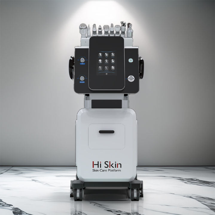 The Hi-Skin III is a state-of-the-art skincare platform that offers a comprehensive range of treatments. It features 9 interchangeable treatment heads, each designed to target different skincare needs: