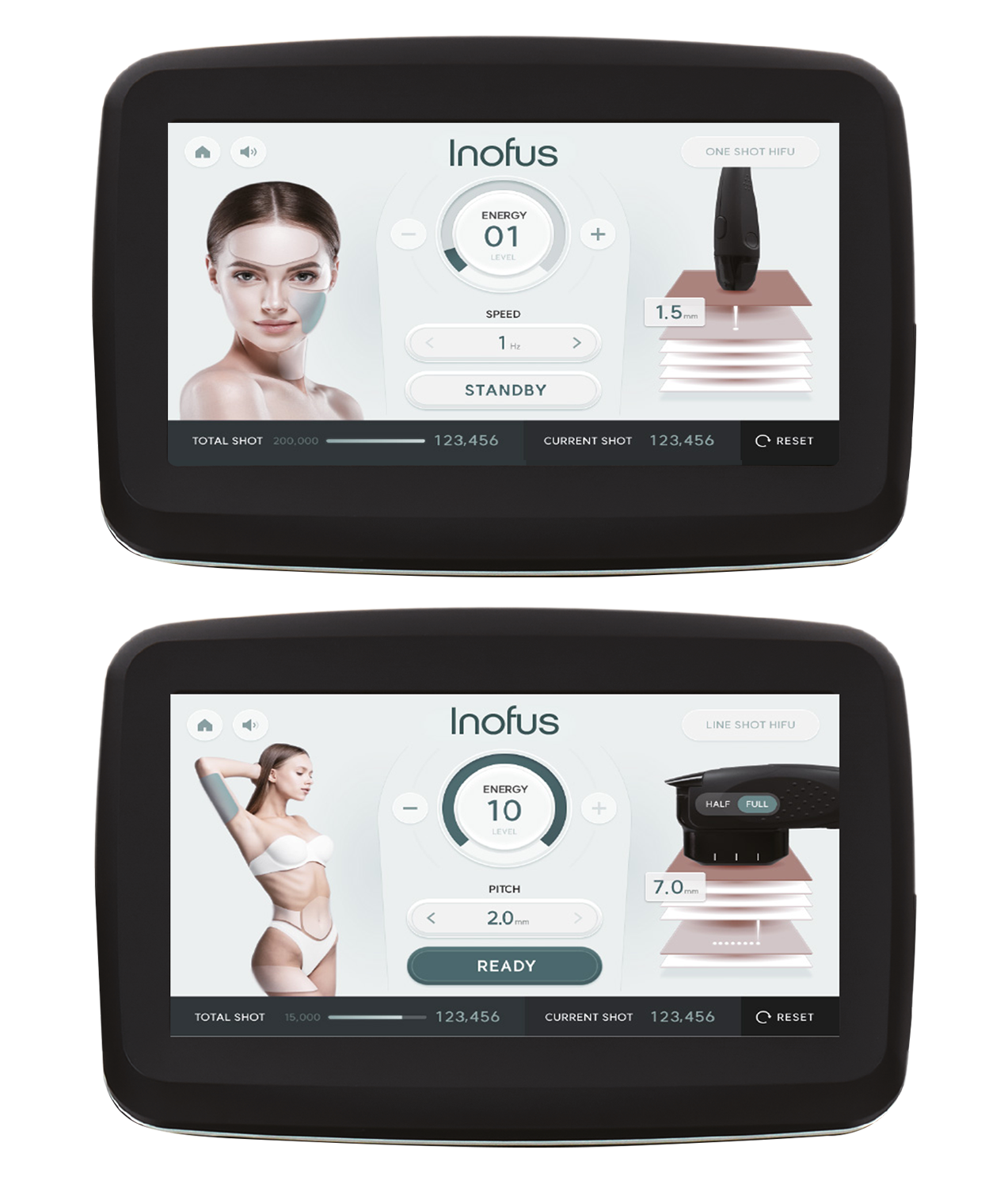 Equipped with two separate HIFU treatment handpieces, Inofus ensures precision and versatility for both the face and body. Our unique CWM Line Shot handpiece has been designed to provide continuous HIFU lines at peak power, enabling you to cover larger areas such as the legs, body and arms, more quickly and thoroughly than other HIFU devices. Plus, Inofus can be set to deliver a massive 60 shots per line. The One Shot HIFU treatment handpiece has been designed to target more precise areas such as the face and neck with unparalleled accuracy, stimulating collagen production and tightening and lifting the skin with precision.