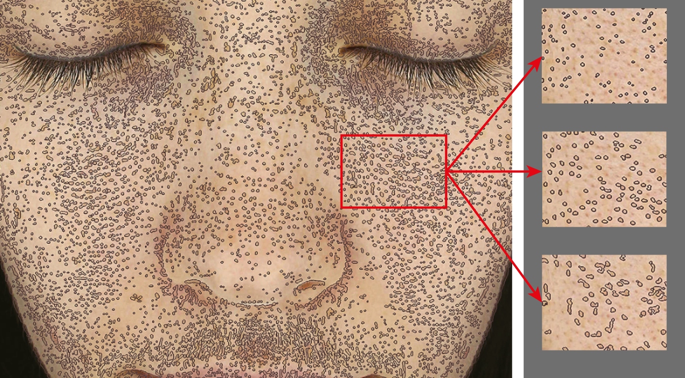 - Pores – Analyses pore size and density to determine clogged pores, excess sebum production, and skin congestion.